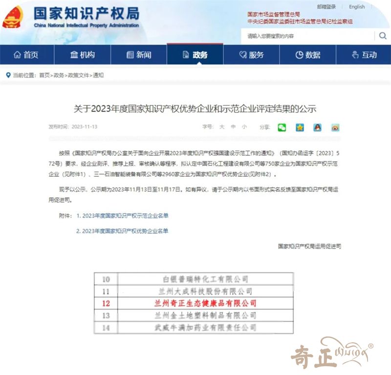 近日,國家知識(shí)產(chǎn)權(quán)局發(fā)布了《關(guān)于2023年度國家知識(shí)產(chǎn)權(quán)優(yōu)勢企業(yè)和示范企業(yè)評(píng)定結(jié)果的公示》,蘭州奇正生態(tài)健康品有限公司(以下簡稱“奇正健康”)憑借在知識(shí)產(chǎn)權(quán)領(lǐng)域的突出優(yōu)勢,榮膺2023年國家知識(shí)產(chǎn)權(quán)優(yōu)勢企業(yè)。